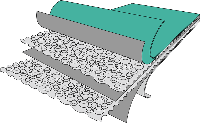 铝球芯板(ALUMINUM BALL CORE PANEL)是以上下两层穹顶状的半球体,相对贴合成一个完整的球体,并以梅花状的阵列分布,构成球体芯层,与面层铝板、底层铝板、高阻燃性高分子膜,根据设定的温度、压力、张力与牵引速度,参照金圆公司专利工艺技术,均匀辊压复合成整体的铝质复合板材。