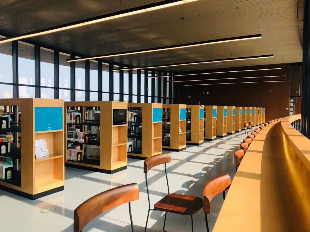 浙江玉环图书馆是铝板表面采用仿木纹处理,与周边绿植相映成趣。